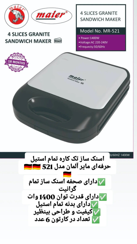 نکته: اطلاعات دقیقتر درباره تعداد خانهها (مثلاً 4 خانه یا غیره)، جنس صفحات (تفلون، گرانیت و...) برای مدل MR-521 بهوجهه رسمی منتشر نشده است؛ این جزئیات در منابعی چون MR-520/514 ارائه شدهاند که دقیقاً متعلق به همین مدل نیستند.